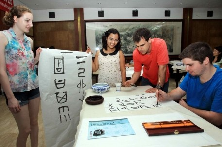 参加此次短训班的十位学生虽然来自不同的国家,汉语水平也比较有限,但对中国博大精深的书法文化都十分崇拜,对结绳记事、仓颉造字等书法故事都很感兴趣,而且每个人还取了朗朗上口的中国名字:白玫、司杰明、安小荷……。课堂上,他们聚精会神的按照兰亭书法博物馆馆长喻革良老师的指导,从握笔、上墨、入画、提勾到点、横撇、捺,从陌生、紧张到轻松、愉快,或许这正是书法艺术植入人心的真正魅力所在。
