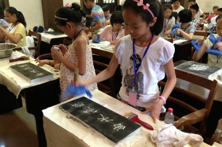 活动中,同学们在讲解员的带领下先参观了“兰亭八景”,与大白鹅合影,在十八缸临字,之后还饶有兴致的参加了书法描红和仿古的曲水流觞演艺活动,午饭后,还在景区工作人员的悉心指导下学习拓碑技艺。湖州市少年宫一行学生均有一定的书法基础,对于书法结构、书法基础知识有一定的掌握和了解,此次来兰亭景区实地膜拜,可谓是理论联系实践最有效的结合。带领刘老师说‘当他提出要带孩子们出去夏令营时,孩子们不约而同的说要来兰亭走走看看,可见,《兰亭序》的书法魅力,兰亭作为书法圣地的地位已经深入每一个书法爱好者的心里。’