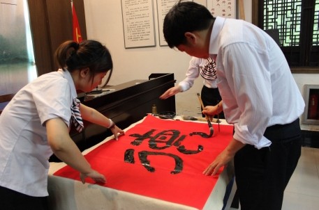 本次道德讲堂紧紧团绕“向善”的主题,从自我反省、唱歌曲、学模范、诵经典、发善心、送吉祥、向“德”字鞠躬、做善事等8个环节进行了宣讲。讲堂上,与会人员认真进行了自我反省,高声齐唱《爱的奉献》,听宣讲员讲述田思嘉等道德模范的典型事例,诵读了管仲的经典名言等。在向“德”字鞠躬环节,景区副主任、书法家喻革良现场挥毫写下了一个大大的“德”字,进行了别具特色的向“德”字行礼的环节。最后,与会人员为兰亭镇小的贫困学生捐献了书籍,表达了一份小小的爱心。