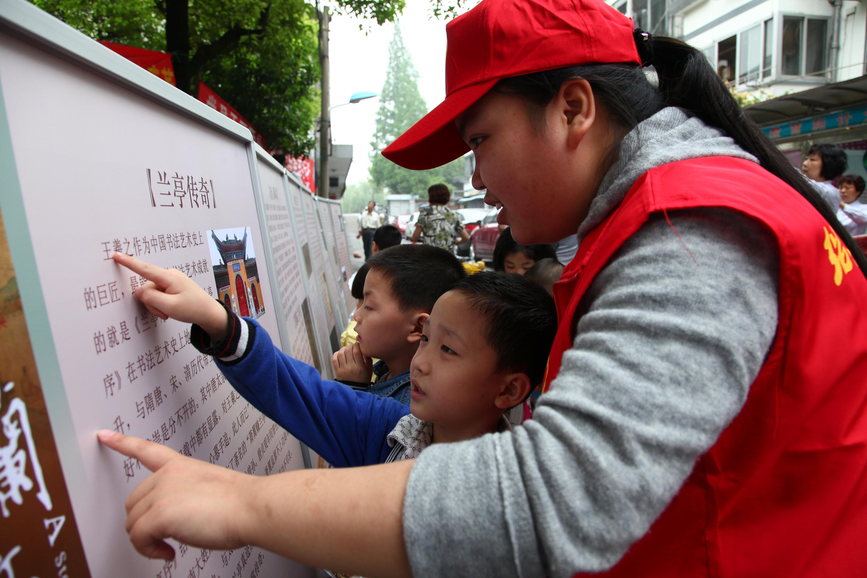 围绕今年博物馆日主题,绍兴博物馆开展了“博物馆志愿者进社区”的活动,由绍兴地区四所高校(文理学院、越秀外国语学院、绍兴职业技术学院以及浙江农业商贸职业学院)的博物馆志愿者参加,将《兰亭的故事》展览送进北海社区,让社区民众能足不出户看展览,同时也宣传5.18国际博物馆日。社区民众、小朋友可以在志愿者的引导下,看展览,写书法,玩拼图。