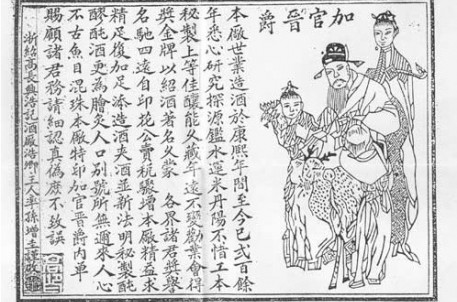 酒坊把煎煮好的酒装坛后,用竹箸包紧坛口,放上图文并茂的坊单,再安上泥质盖,然后敷以黄泥封坛。经过贮存,当人们开启黄泥封土,即能见到详细介绍黄酒的坊单。这里介绍一张清代康熙年间绍兴高长兴浩记酒厂坊单(见图)。名为“加官晋爵” 坊单图。现把坊单中文字抄录如下:
