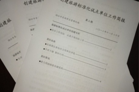 为积极推进景区创标工作开展,提高员工对创标工作知晓率、普及率及参与率,东湖景区创建旅游标准化试点单位工作简报创刊,并已成功印发三期。