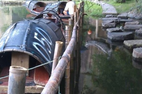 景区乌大门至寒碧亭间有一段别致的汀步桥,此桥由若干块长条石交错的“种”在水中形成的。近日,东湖景区为考虑游客安全,在汀步桥20公分外“种”上一排毛竹,做成扶栏状。既提高了游客的安全性,也可以给船工停靠纳凉提供便利,同时,其简单自然,而又略带野趣的设计手法又给东湖添一小景。