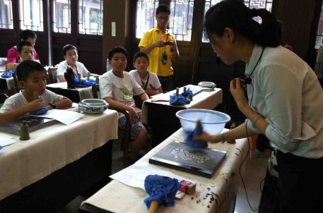 7月11日,来自广东东莞的200名小学生来到书法圣地兰亭参观,学习和体验拓碑工艺,感受中国传统文化的魅力。在书苑里报告厅,小朋友们分批参与,先是听工作人员介绍和演示拓碑的方法,然后两人一组,按“清洁、上纸、敲打、上墨、晾干”的五步程序,开始自己动手制作拓片。在工作人员的耐心指导下,小朋友们对拓碑表现出了浓厚兴趣,拓完后互相展示、比较各自的劳动成果,觉得不满意的纷纷要求再拓一张。最后,每位小朋友开心地将自己做的拓片放进书包,表示要带回家给父母看。