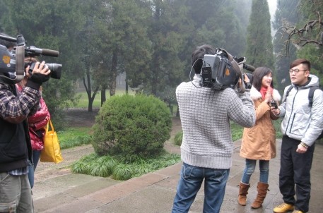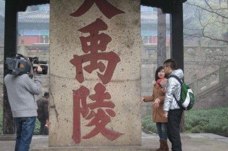 2月21日上午,濛濛细雨,杭州电视台生活大参考栏目《就要酱紫玩》节目组一行6人,在旅游集团营销部人员的陪同下,来大禹陵景区拍摄。《就要酱紫玩》是杭州生活频道的一档周日特别旅游节目。节目组一行人对大禹陵的自然风光和大禹的历史背景很感兴趣,他们仔细聆听了讲解员的讲解,对这位古代的治水英雄,中华民族的立国始祖有了一定的了解。节目组对大禹陵碑做了主要的拍摄。