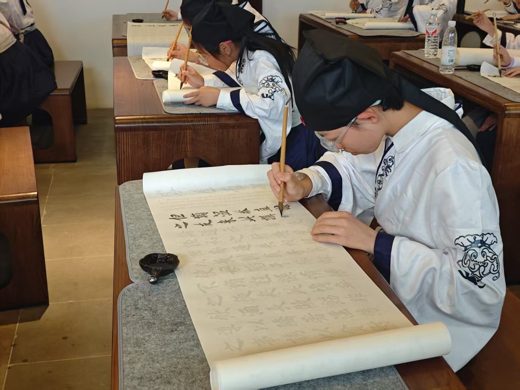 《客座私祝》是王阳明先生奉命征剿叛乱之际,对其子弟及来访客人的殷切期望与告诫,强调了择友之道、道德修养及家庭教育的重要性;同时也是先生为数不多留存于世的纸本楷书作品,展示了其精美的书法艺术。阳明故里特此推出“探墨《客座私祝》 感悟先圣教诲”研学游课程,旨在引领学生们穿越时空,聆听阳明先圣的教诲,从中汲取智慧与力量,培养青少年正确的价值观和道德观念。