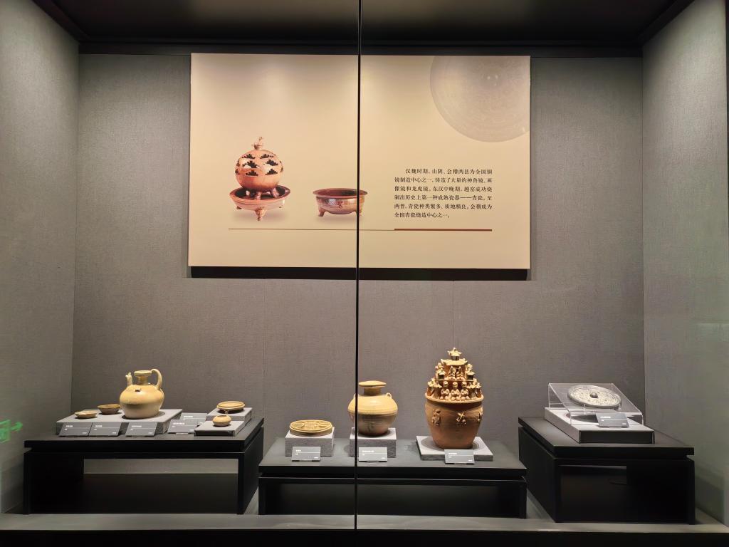 汉魏时期山阴、会稽两县是全国铜镜制造中心之一,铸造了大量的神兽镜、画像镜和龙虎镜。东汉中晚期,越窑成功烧纸出历史上第一种成熟瓷器——青瓷。至两晋,青瓷种类繁多,质地精良,会稽成为全国青瓷烧造中心之一。此处展出了汉魏时期的铜镜和青瓷实物。