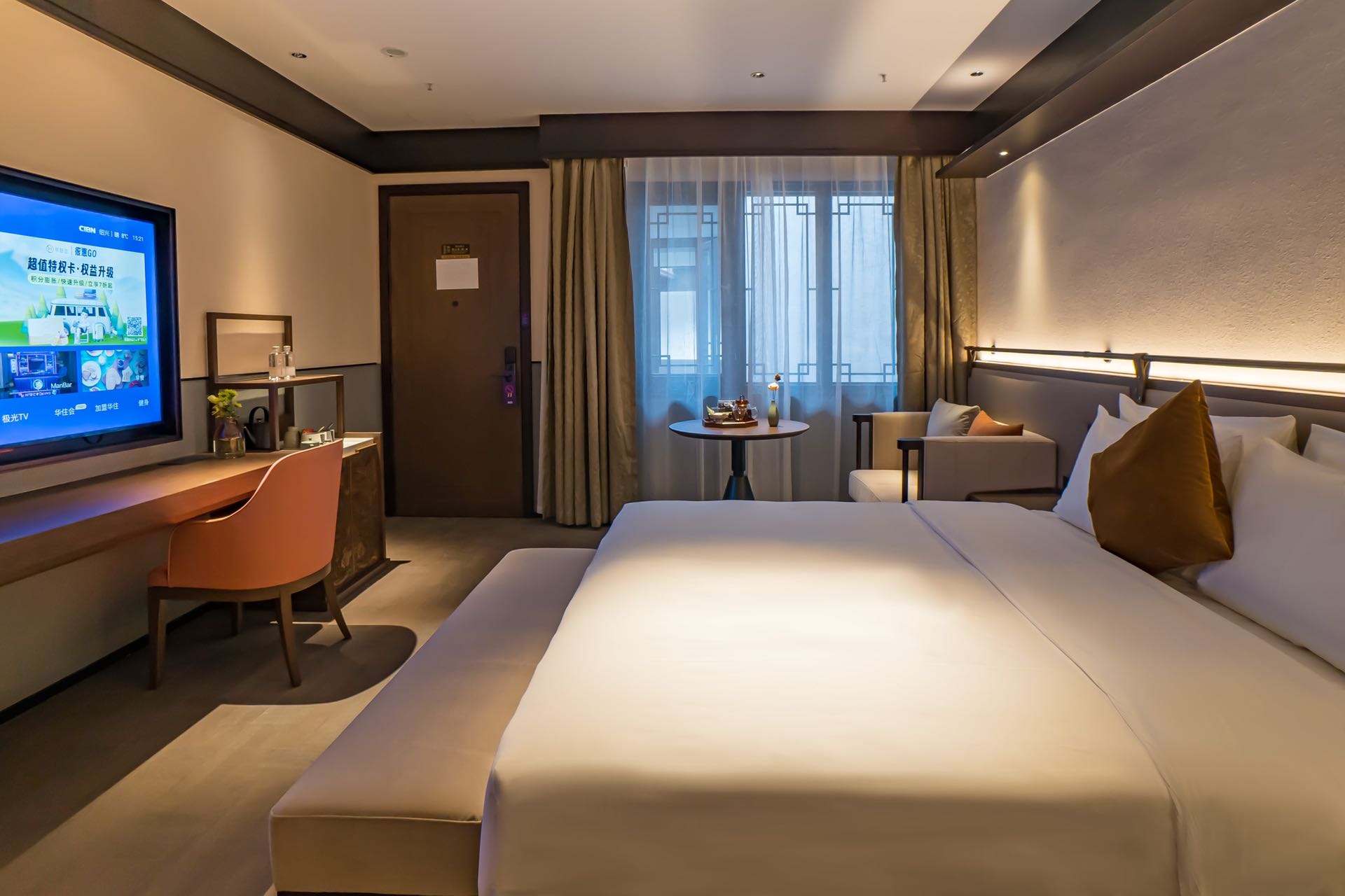 酒店以国风院落为基调,独门别院环境优美,拥有大床房、双床房、亲子房、家庭房、套房等多种房型