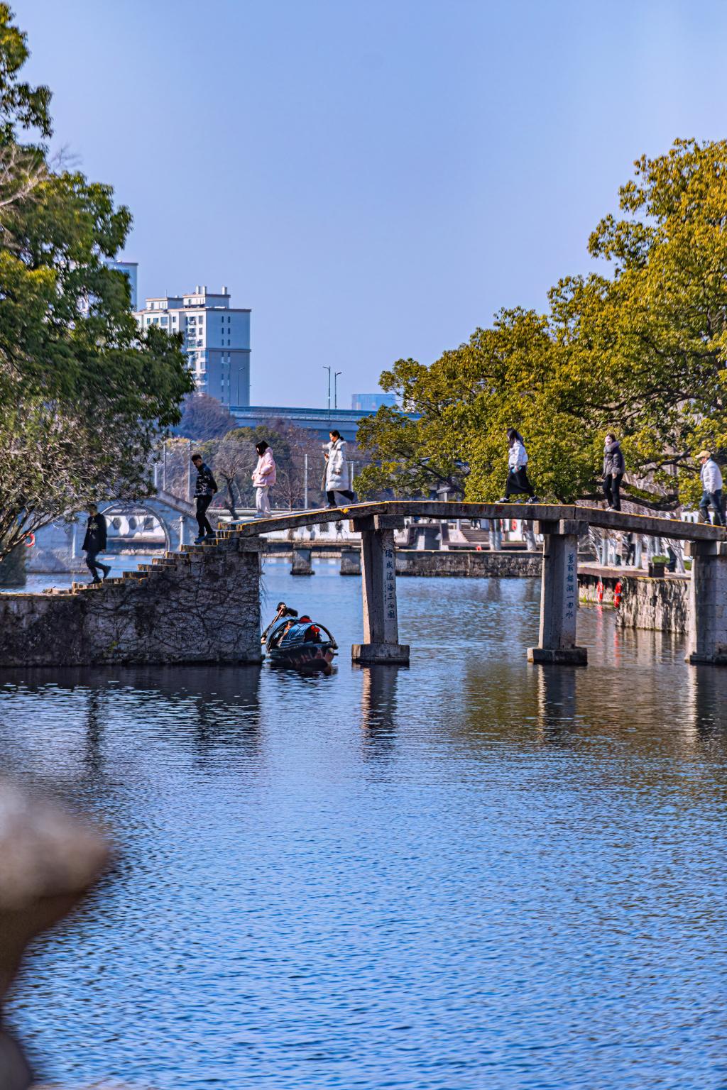 东湖最别出心裁的石板桥是“霞川桥”。此桥一改绍兴石桥---大脚圆拱的款式,采用板墩板桥,轻灵简洁。桥下两个板墩、三个桥孔将湖水分成三行,小桥在晚霞映照下会隐约在平静的湖面上映出“川”字,“霞川桥”就是以这份意境而命名的。桥两侧为楹联一副:“剪取鉴湖一曲水,缩成瀛海三山图”。主人把东湖比作《山海经》传说中的三座仙山,蓬莱、瀛洲、方丈,自豪之情由此可见一斑。