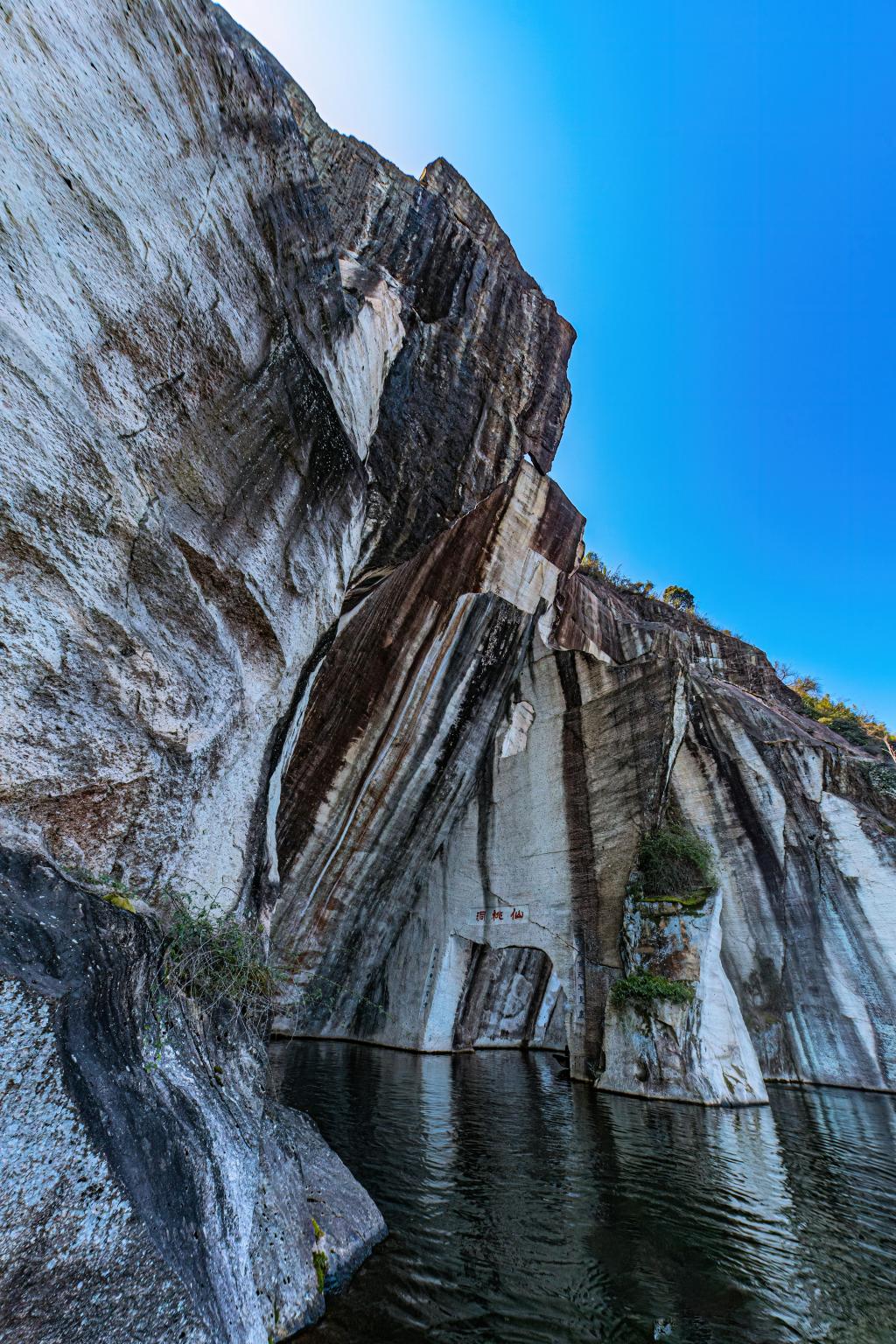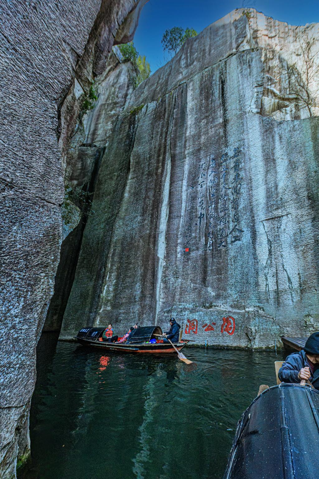 陶公洞是东湖最经典的三洞之首,也是最具特色的核心景点。洞内水面距离山顶47米,距离湖底18米,好像一口天然巨井,更似一口扣水巨钟。当小小的乌篷船悠悠驶入洞穴,越往前行,阳光越淡,回望来路,曲曲弯弯,岩壁深深浅浅,与洞口的一线阳光融合。洞口摩崖石刻是一首四言诗,为1962年郭沫若先生秋游东湖时有感而发:“箬fen(第二声)东湖,凿自人工。壁立千尺,路隘难通。大舟入洞,坐井观空。勿谓湖小,天在其中。”全面概括了东湖及陶公洞的特色。