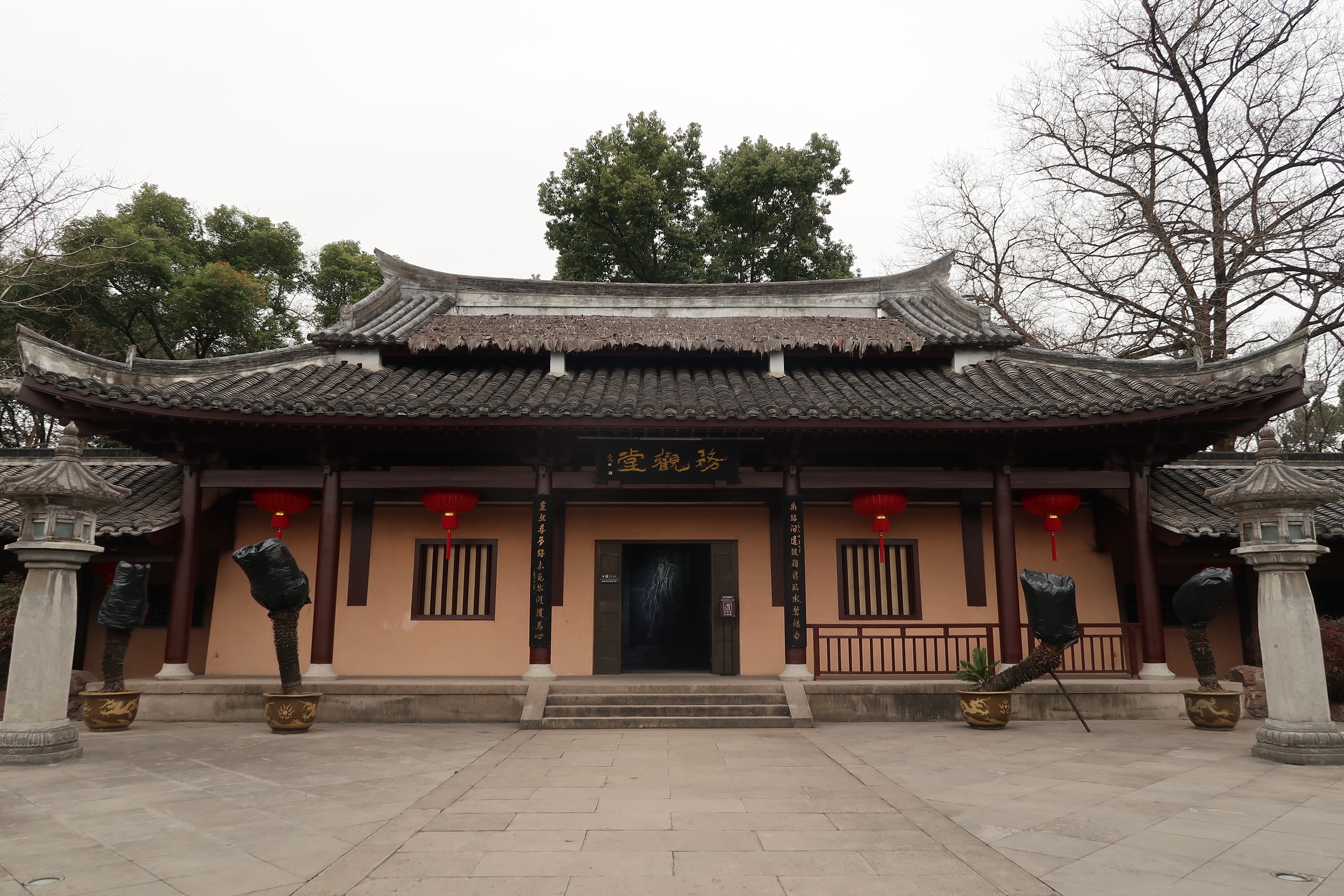 六朝井亭是唐、五代、宋、明、清的亭阁、砖井、池塘和假山等建筑遗址多处,是沈园悠久历史的实物见证。“六朝井亭”亭内有古井一口,此井亭中间可以望到天空,亭顶中空,可以使井承天露,象征诗人覆水欲收的意愿。中空“承天光”,解决雨水活性和采光。使人们从中体现向往婚姻光明自由的愿望
