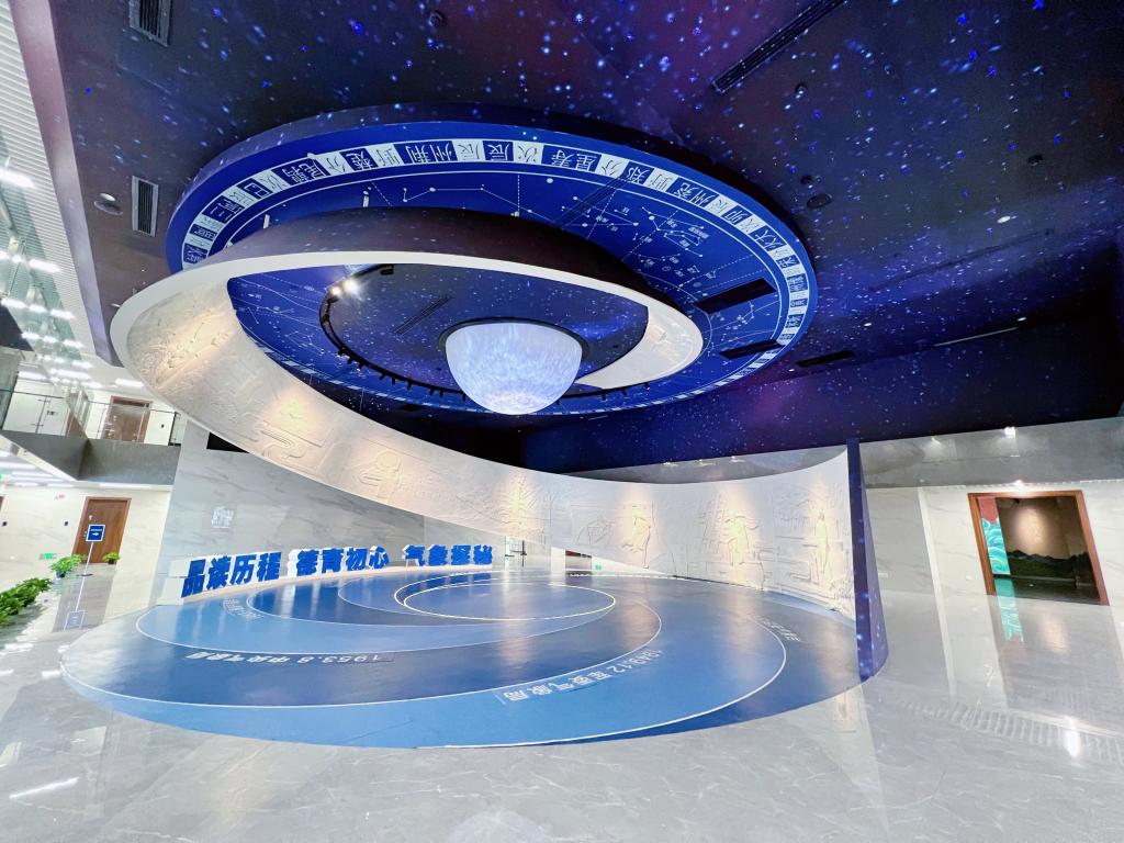绍兴气象博物馆的序厅,中间是主题造型建筑,以飞舞向上的螺旋造型浮雕和顶部星空天花造型为基础,螺旋向上的浮雕体现气象从古到今的现代化发展历程,顶部天花为中国二十八星宿天文图,展示气象与天文之间的密切关系,众所周知的二十四节气就是由我国古人在观察地球绕日公转,日影长度的变化而归纳总结出