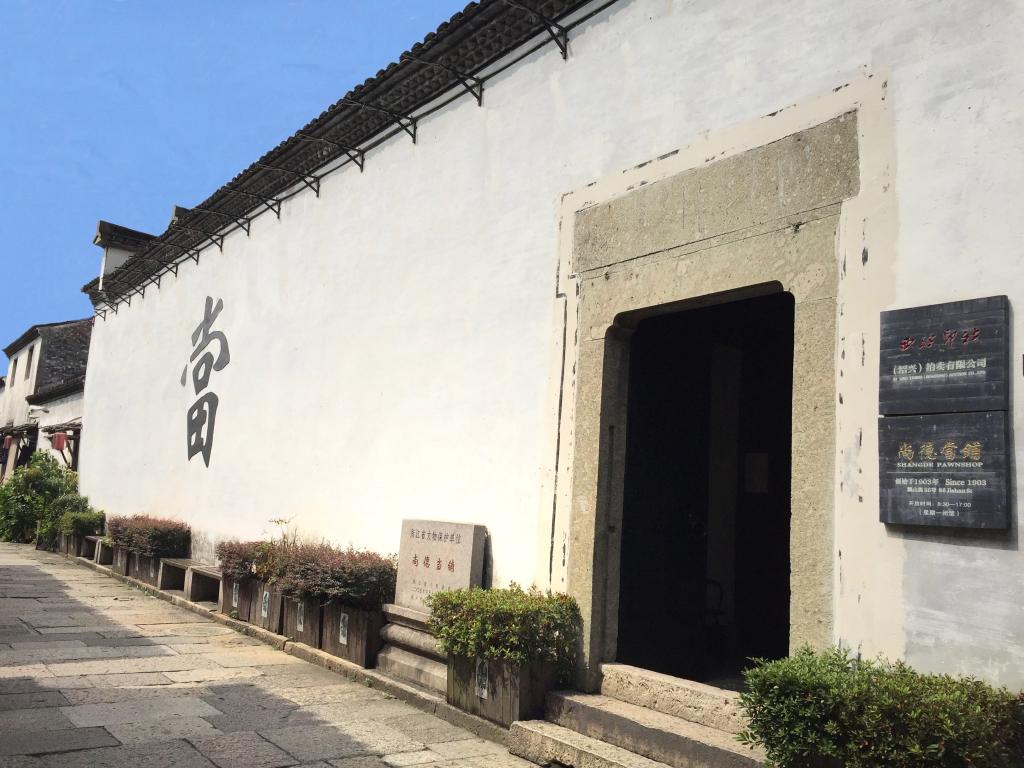 尚德当铺,又名“三槐堂”,2005年被列为省级文保单位。建于清代,当铺两边墙各嵌着石碑,刻有“三槐堂王界”。“三槐堂”是王氏的堂号,三槐王氏是当今王氏中最大的一支。当时的绍兴当铺遍及城乡,光绪年间就有64家之多,尚德当铺便是其中之一,当铺老板王百万即为三槐堂王氏的后裔。三槐堂前为当铺,后为宅院,是清末绍兴典型的商住合一建筑
