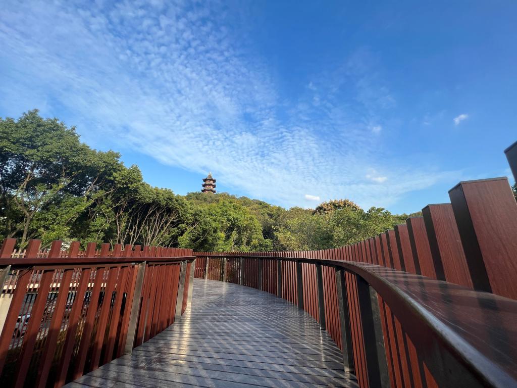 蕺山栈道连接古城北入口文化公园游步道和蕺山山体,总长约170米,平均高度约8米,步道宽2.3米。通过旋梯下连古色古香的游步道,上通“S”形廊桥,直达蕺山之巅—文笔塔。登塔俯瞰栈道,只见栈道隐掩于绿荫之中,宛若游龙,古朴的木色栈道与古色古香的游步道相连,旁边层楼叠榭,气韵流畅。当夜幕降临,灯光点缀,悠悠古韵与绿色生态相融,成为绍兴城市夜晚最美的风景