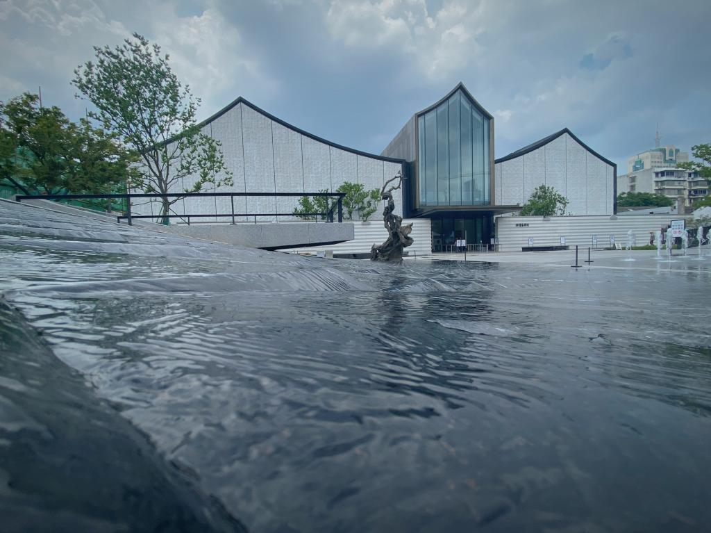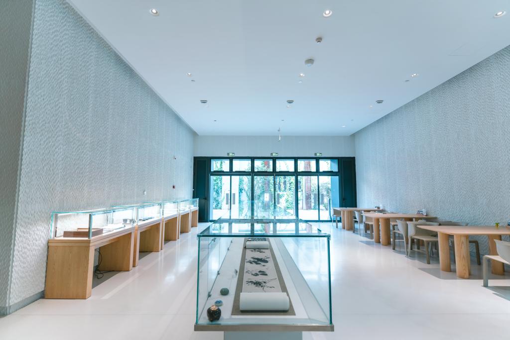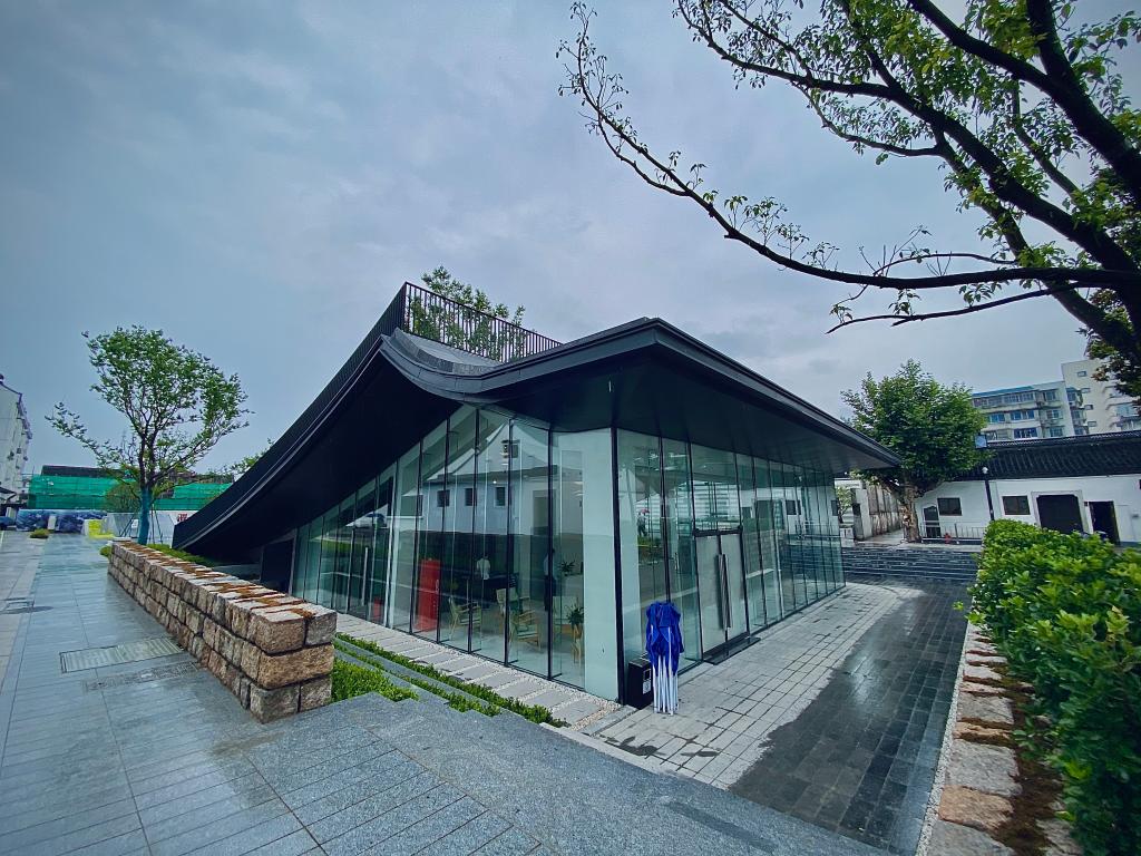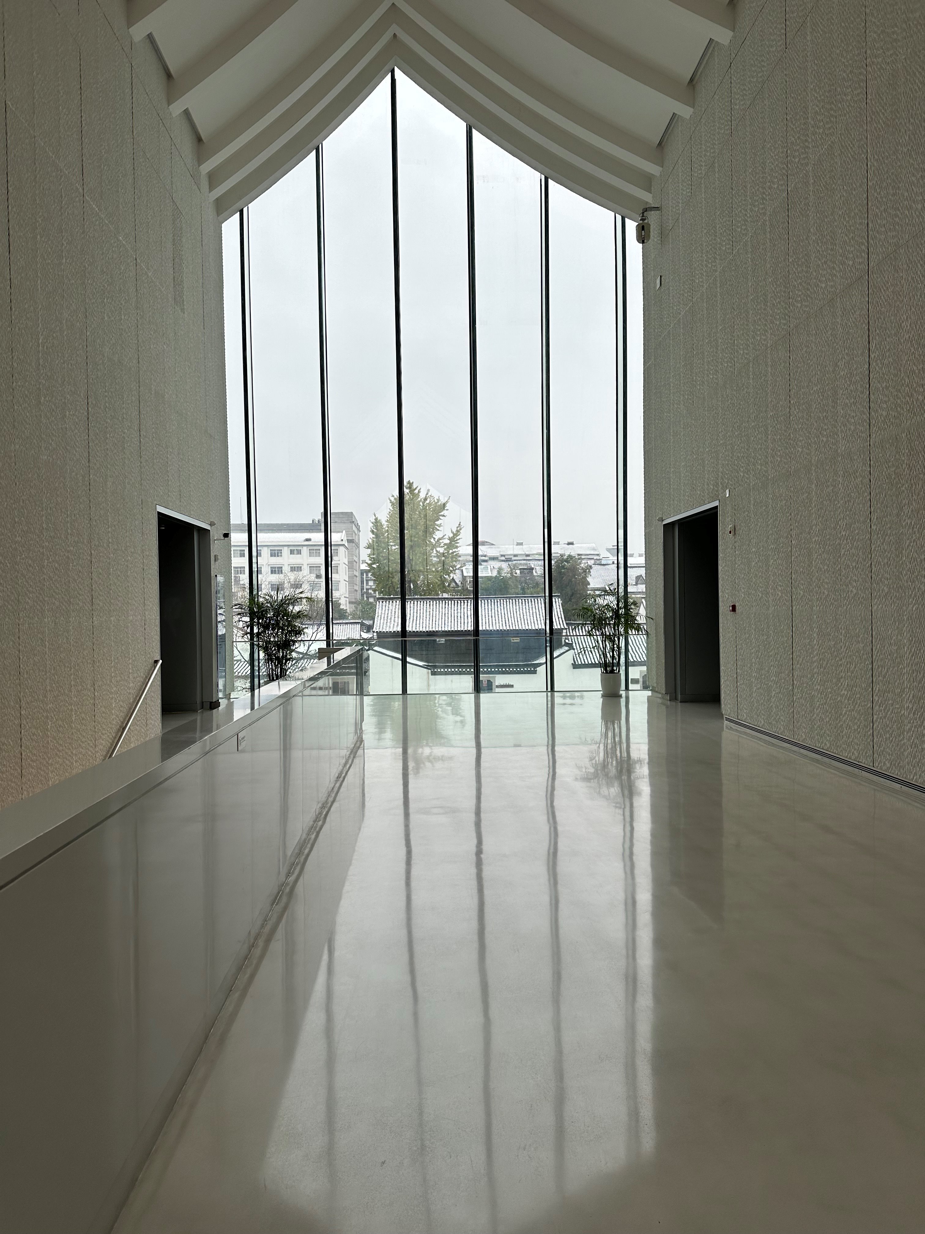 徐渭艺术馆二楼的大面玻璃墙简约而富有格调,呈尖顶形态,将室外建筑、树木与天光引入室内,营造出通透、静谧且融合自然与建筑美学的氛围