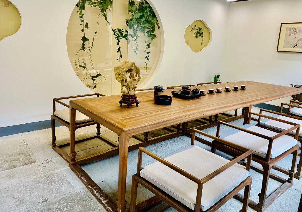 大乘弄12号为一幢两层建筑,一层为公共区域,二层是包厢区,可供游客在这里歇息品茶,空间布局合理,家具为明式改良款,在颇具亲和力的木质色调基础上,加入了明代崇尚的红色缀色,令整个空间更为温馨