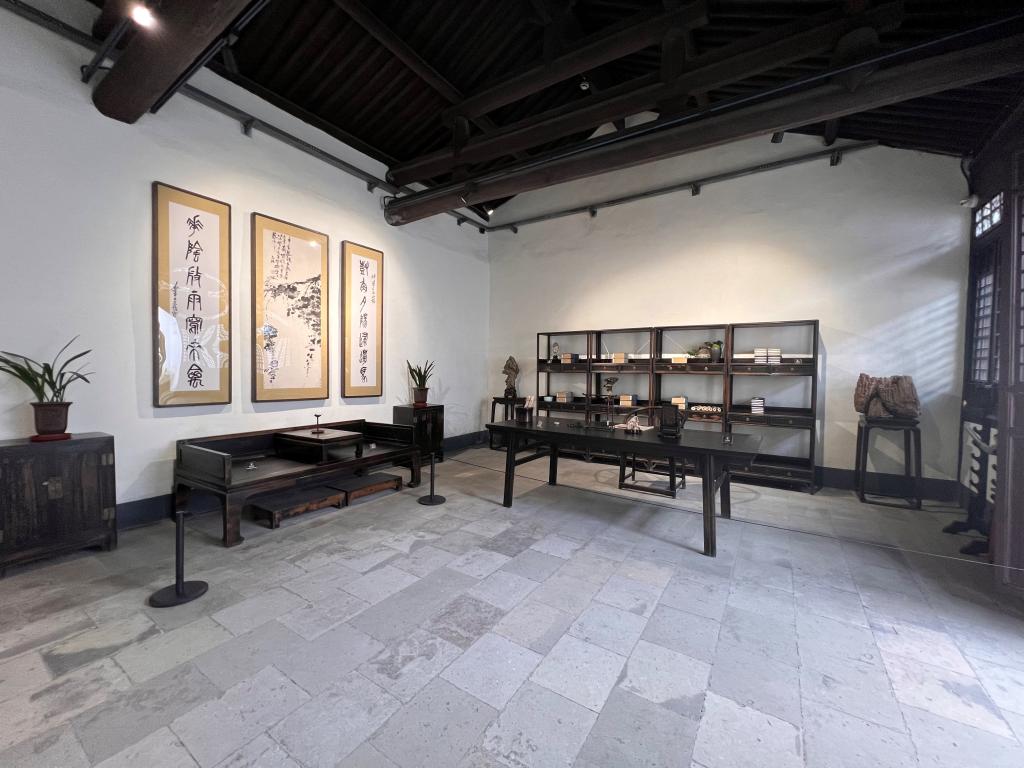 前门上方的匾额“洒翰斋”为徐渭手迹,他青少年在此习书作画。墙面挂着《墨葡萄图》,水墨淋漓,使中国画的特征得到了充分的表现,同时图上所题诗句“笔底明珠无处卖,闲抛闲掷野藤中”,更使人强烈地感受到他纵情但又不愿驯服的内心世界。两侧有吴昌硕篆书七言联“树角夕阳归邋马,花阴微雨写来禽。仲清仁兄正譌,安吉吴俊卿”。室内陈列了画案,文房四宝,明式书柜兼博古架,架上有仿古线装书及仿明代瓷杂若干。北墙悬挂了蒙...