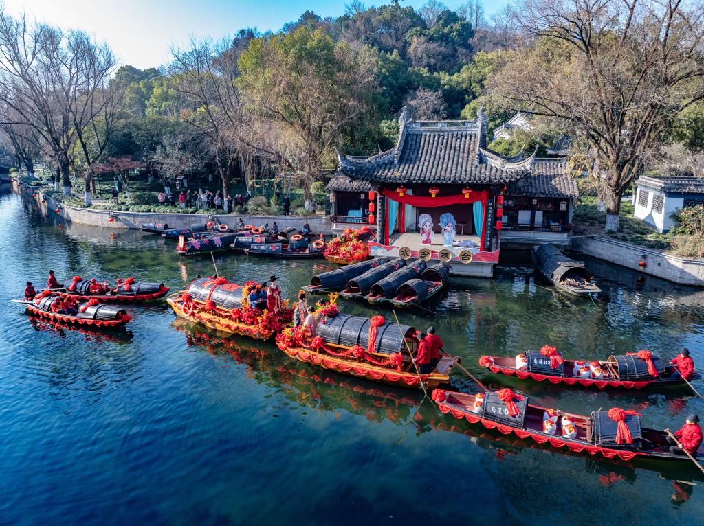 在鲁迅故里、城市广场水巷,开启一场老绍兴水上迎亲巡游,伴随着热闹的锣鼓、喜庆的唢呐,新人携手一起跨火盆、过马鞍、挑盖头、拜天地、许誓言,向大家分撒喜糖。在鼓乐声中,一对新人坐着乌篷水上巡游,将浪漫演绎到极致。围观群众可以加入迎亲的船队,沾沾新人喜气。新人在众人的祝福中完成一场传统水上婚礼,携手开启幸福人生。